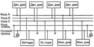 Четырехпроводное ответвление от магистрали делают при трехфазном вводе. Необходимость в нем возникает, когда нужно подключить трехфазный электродвигатель или равномерно распределить по фазам однофазные нагрузки. К каждому из фазных проводов подключают приблизительно равное число ответвлений от домов, к фонарному подключают по одному проводу каждого светильника, к нулевому проводу все ответвления к домам, а также светильники.