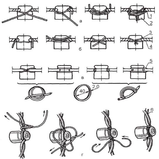 Рис. 5. Способы привязки проводов к роликам: а - крестом с хомутом; б - крестом; в - полихлорвиниловыми кольцами; г - вязкой: 1 - провод АПР1?6; 2 - ролик РП-6; 3 - вязальная проволока; 4 - изоляционная лента; 5 - полихлорвиниловое кольцо; 6 - провод ПРВД