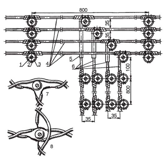 Рис. 6. Ответвление проводов при прокладке на роликах проводов АПР и ПРВД: 1 - шуруп; 2 - проволока вязальная; 3 - ролик РП-6; 4 - провод АПР1?6; 5 - изоляционная трубка; 6 - провод АПР1?4; 7 - к выключателю; 8 - к выключателю и лампе