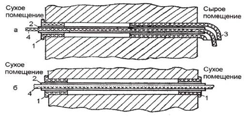 Рис. 7. Проход проводов через стену: а - из сырого в сухое помещение; б - из сухого помещения в сухое: 1 - втулка; 2 - изоляционная трубка; 3 - воронка; 4 - провод