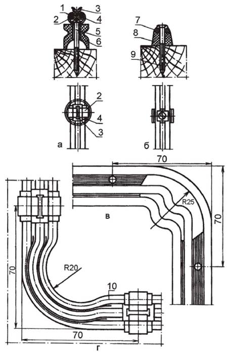 Рис. 8. Прокладка проводов на роликах, примеры изгиба проводов: а - провод АППВ на роликах; б - провода АППВ, АПН, АПР, АПРВ по деревянным основаниям на клицах; в - пример изгиба проводов марок АППВ и АППР; г - пример изгиба проводов марок АПВ, АПН и АПРВ на ребро: 1 - провод АППВ 2x6; 2 - полоска; 3 - пряжка; 4 - прокладка из электрокартона; 5, 9 - шурупы; 6 - ролик РП-2,5; 7 - провод АПР; 8 - клица; 10 - провод АПН 3x4 |