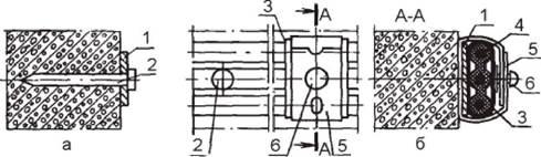 Рис. 9. Крепление проводов марок АПВ, АППВ, АПН, АПРВ к бетонным основаниям по пристреливаемой стальной полосе: а - крепление полосы дюбель-гвоздем; б - крепление провода: 1 - полоса; 2 - дюбель-гвоздь; 3 - прокладка из электрокартона; 4 - провод АПН 3?4; 5 - лента монтажная; 6 - монтажная кнопка |