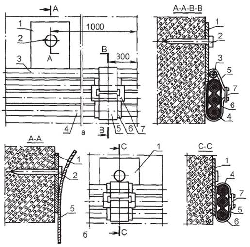 Рис. 10. Крепление проводов марок АПВ, АЛПВ, АЛН, АПРВ к бетонным и кирпичным основаниям: а - по пристреливаемой проволоке; б - по пристреливаемым закрепам с полосками: 1 - пластинка; 2 - дюбель-гвоздь; 3 - проволока; 4 - АПН 3x4; 5 - прокладка из электрокартона; 6 - стальная полоса; 7 - пряжка |