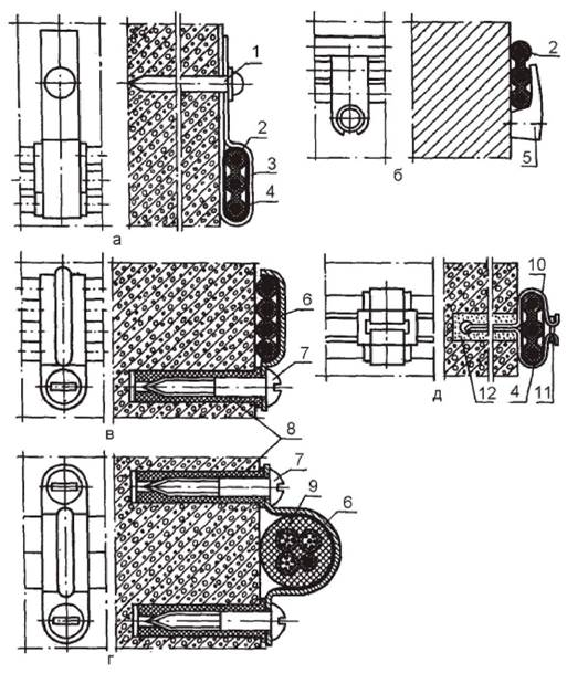 Рис. 11. Крепление проводов марок АПВ, АППВ, АПН, АПРВ и кабелей АВРГ и АНРГ к бетонным и кирпичным основаниям: а - при помощи полоски, прибиваемой дюбелем-гвоздем (ручная забивка); б - при помощи пластмассовых скоб; в и г - при помощи скоб с одной и двумя лапками; д - при помощи полоски, вмазанной в основание: 1 - дюбель-гвоздь; 2 - провод АПН 3?4; 3, 10 - полоска; 4 - прокладка из электрокартона; 5 - пластмассовая скоба; 6 - скоба; 7 - шуруп; 8 - капроновый дюбель; 9 - кабель АВРГ (АНРГ) 3?10 + 1?6; 11 - пряжка; 12 - алебастр |