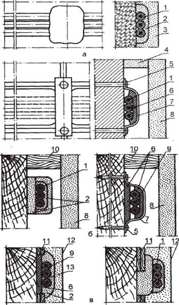 Рис. 12. Скрытая прокладка проводов: а - провода марок АППВС, АПН, АПВ по несгораемым основаниям под мокрой и сухой штукатуркой; б - тех же проводов по деревянным основаниям под сухой штукатуркой; в - по деревянным основаниям под мокрой штукатуркой: 1 - провод АППВС; 2 - алебастр; 3, 13 - мокрая штукатурка; 4 - гипсовый намет; 5 - гвоздь; 6 - алебастровая прокладка; 7 - полоска; 8 - сухая штукатурка; 9 - провод АПН или АПВ; 10 - рейка; 11 - дрань штукатурная; 12 - контур мокрой штукатурки |