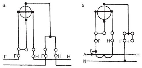 Рис. 20. Включение однофазного счетчика: а - однофазный счетчик непосредственного включения; б - включение однофазного счетчика через трансформатор тока; Г - генераторные зажимы; Н - зажимы для нагрузки |