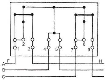 Рис. 24. Схема учета энергии в четырехпроводной сети при неравномерной нагрузке фаз с помощью трехфазного счетчика СА4 непосредственного включения |
