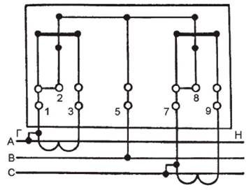 Рис. 22. Схема включения счетчиков САЗ-И670М и САЗ-И681 через трансформаторы тока в трехпроводную сеть |