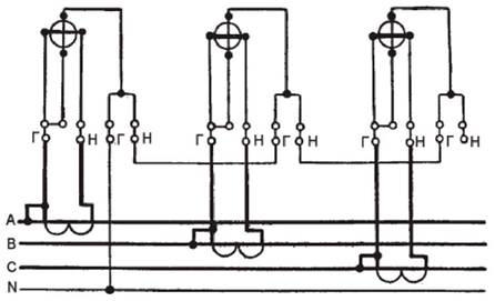 Рис. 23. Схема учета энергии в четырехпроводной сети при неравномерной нагрузке фаз с помощью трех однофазных счетчиков, включенных через трансформаторы тока |