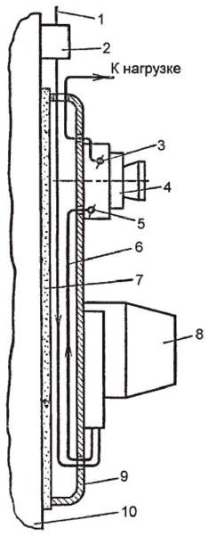 Рис. 25. Подсоединение квартирного щитка: 1 - провода ввода; 2 - отключающий аппарат; 3 - винт отходящей линии; 4 - предохранитель; 5 - винт центрального контакта; 6 - провод от счетчика к предохранителям; 7 - асбестовая прокладка; 8 - счетчик; 9 - корпус щитка; 10 - деревянное основание |