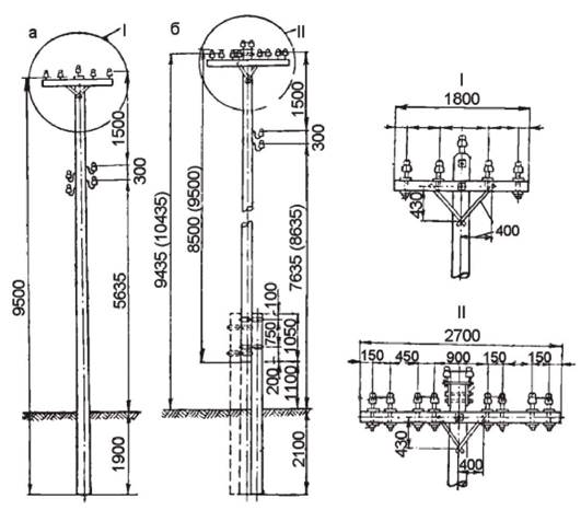 Ответвительные и перекрестные опоры могут быть промежуточными, угловыми и анкерными. Конструкции и основные размеры типовых деревянных опор, наиболее часто применяемых для линий, показаны на рис. 33, 34, 35.