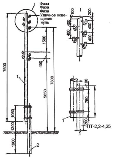 Рис. 34. Промежуточная деревянная опора с железобетонной приставкой ПН-1ДБ: 1 стойка: 0140, длина 7500 (6900); 2 - приставка ПТ-2,2-4,25 |