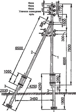 Рис. 35. Деревянные угловые и анкерные опоры с железобетонными приставками (УПН- 1ДБ; УАН-1ДБ; ОАН-1ДБ): 1 - стойка: 0180, длина 7500; 2 - подкос: 0180, длина 6500; 3 - приставка ПТ-2,2-4,25 |