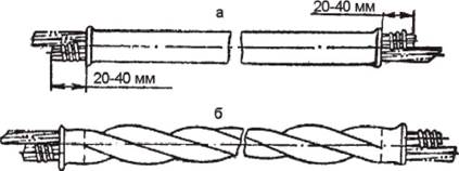 Рис. 38. Соединение сталеалюминиевых проводов овальным соединителем СОАСметодом скручивания: а - соединитель с введенными проводами; б - скрученный соединитель |
