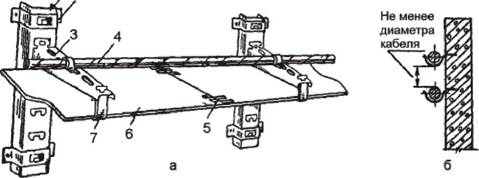 Рис. 41. Открытая прокладка кабелей: а - на сборных кабельных конструкциях; б - на скобах по стенам: 1 - стойка; 2 - скоба; 3 - полка; 4 - кабель; 5 - соединение перегородок; 6 - асбестоцементная плита; 7 - подвеска |