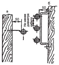 Проходы через деревянные стены и перегородки выполняются в отрезках стальных или асбестоцементных труб диаметром не менее 100 мм, выступающих в обе стороны от стены или перекрытия на 50 мм (рис. 45 б), либо через несгораемую заделку размером 150x150 мм.
