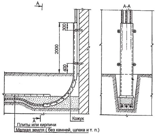 Концы труб должны выступать за стены здания в траншею не менее чем на 0,6 м (рис. 43). При выводе кабелей из земли и подъеме на стену их защищают от механических повреждений трубой, уголком, швеллером или коробом на высоту 2 м (рис. 44).