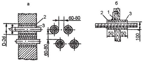 Рис. 45. Проход кабелей через стены: а - несгораемые; б - сгораемые; 1 - скоба; 2 - труба; 3 - заделка в трубе |