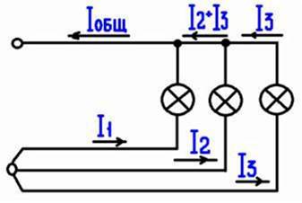 При этом, ток в каждой цепи будет разный и будет суммироваться в местах соединений. 1общ = И+12+13+ .+1п