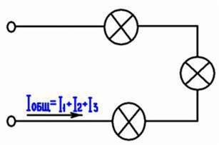 В этом случае по всем включенным в цепь нагрузкам будет проходить суммарный ток и в случае выхода из строя одного из потребителей вся схема перестанет работать. Такие схемы используются в новогодних гирляндах. Кроме того, при использовании элементов разной мощности в последовательной цепи, слабые приемники просто перегорают.