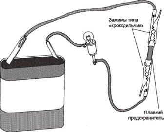 Простейшим является тестер электропроводности, состоящий из батарейки, электрической лампочки и двух проводов (рис. 28). Для проверки цепи тестер подключают к испытываемой цепи с помощью зажимов типа «крокодильчик». Если лампочка горит, значит цепь закорочена, если лампочка гаснет - цепь разорвана.