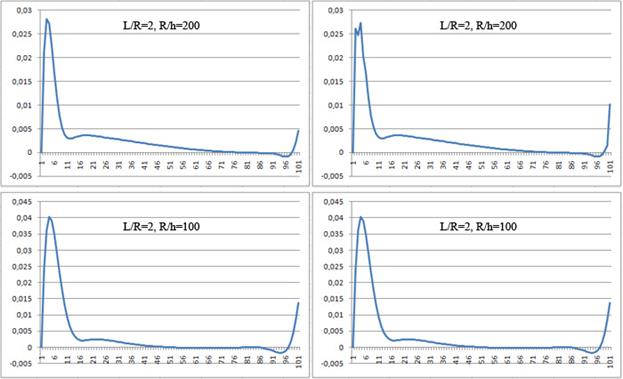 При параметрах цилиндра L/R=2 и R/h=200 все же оказываются необходимыми процедуры ортонормирования. Но на современных персональных компьютерах уже не наблюдаются сплошные скачки значений от больших отрицательных до больших положительных по всему интервалу между краями цилиндра - как это было на компьютерах поколения 286. В частном случае L/R=2 и R/h=200 наблюдаются лишь незначительные скачки в районе максимума изгибающего обезразмеренного момента М1 на левом крае и небольшой скачек обезразмеренного момента М1 на правом крае.