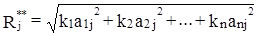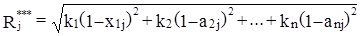 Формула (А) определяет рейтинговую оценку для j-ого анализируемого предприятия по максимальному удалению от начата координат, а не по минимальному отклонению от предприятия-эталона. Упрощенно это значит, что наивысший рейтинг имеет предприятие, у которого суммарный результат по всем однонаправленным показателям выше, чем у остальных.