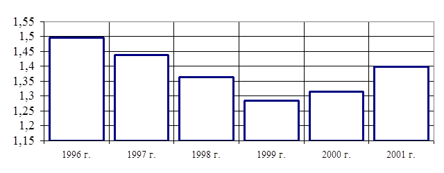 По данным табл. 3.2 можно сделать вывод, что в целом по анализируемым предприятиям КОЛ хоть и выше 1, но, тем не менее, не удовлетворяет требованиям отечественного законодательства, поэтому руководству оцениваемых предприятий необходимо уделить особое внимание управлению структурой активов и пассивов. Динамика среднего значения коэффициента общей ликвидности представлена на рис. 3.1.