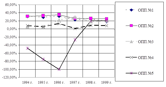Помимо двух указанных ОПП, особое внимание по данным табл. 3.16 следует обратить также на ОПП №3, чистый финансовый результат которого в течение 1996-2001 гг. являлся предметом пристального внимания налоговых органов. Тем не менее, ситуацию удалось выправить и в 1999-2001 г. практически все предприятия сумели добиться положительных финансовых результатов.