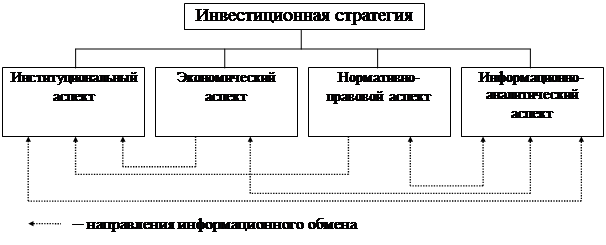 Описание инвестиционной стратегии, как и любого многогранного понятия, не исчерпывается лишь простым определением. Инвестиционная стратегия, по нашему мнению, является структурированной совокупностью нескольких взаимосвязанных аспектов, таких как: институциональный, экономический, нормативно-правовой, информационно-аналитический и другие (рис. 3.6).