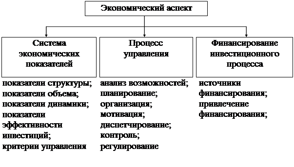 Экономический аспект – совокупность экономических частей инвестиционной стратегии, к которым относятся: система экономических показателей для оценки инвестиционной стратегии, управление, финансирование инвестиционного процесса. В рамках экономического аспекта выделяются основные методы, критерии и цели инвестиционной стратегии (рис. 3.8).