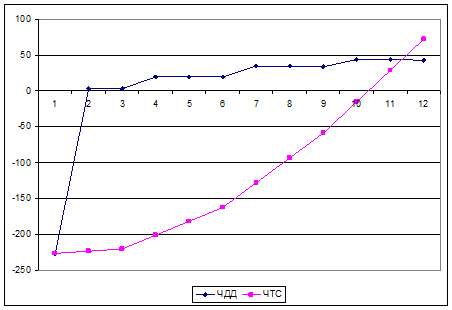 Эффективность проекта может наглядно проиллюстрировать изображенный на рисунке 3.2. график ЧДД и ЧТС.