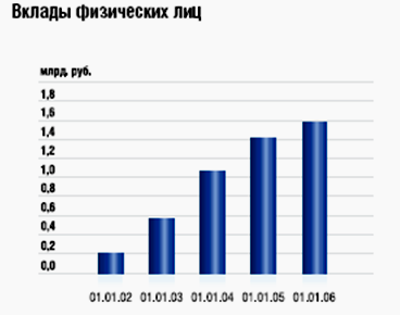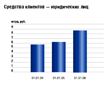 Все это позволило Банку увеличить в 2005 году объем привлеченных средств корпоративных клиентов на 40%. Совокупный объем выпущенных собственных векселей также увеличился на 5,5%. Общий объем средств юридических лиц (за исключением финансовых организаций), привлеченных Банком, увеличился в 2005 году на 2,6 млрд. руб. Все это свидетельствует о постоянно возрастающем доверии к Банку со стороны корпоративных клиентов.