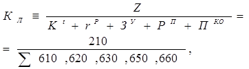 где Z – запасы, Кt – краткосрочные кредиты и займы, rp – краткосрочная кредиторская задолженность, ЗУ - задолженность участникам по выплате доходов, РП - резервы предстоящих расходов, ПКО – прочие краткосрочные обязательства, ∑- сумма строк баланса |