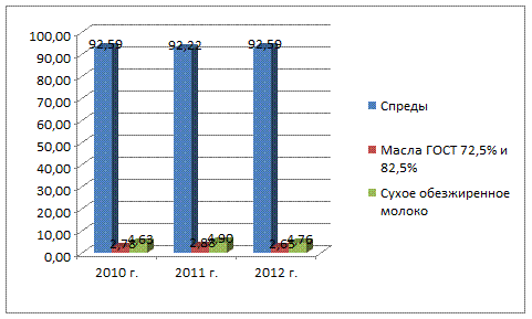 Рассмотрим динамику выпуска отдельных видов продукции в общем объеме продукции ООО «Тульчинка.RU» за 2010 - 2012 гг. (рис.2.1.).