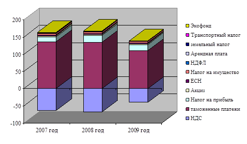 Налог на добавленную стоимость имеет отрицательное значение, как отмечалось ранее это объясняется тем, что большое количество продукции предприятия идет на экспорт, так же идет ввод основных средств. В 2007 году составила - 63,19 %, в 2008 году - 67,5 %, в 2009 году уровень доли НДС составил 39,608 %.