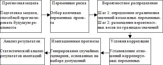 Как уже отмечалось, анализ рисков с использованием метода имитационного моделирования Монте-Карло представляет собой интеграцию методов анализа чувствительности и анализа сценариев на базе теории вероятностей.