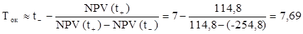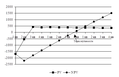 На основании определения чистого денежного потока найдем показатели срока окупаемости, доходности, рентабельности и внутреннюю норму доходности предлагаемого инвестиционного решения. Срок окупаемости находится на основании графика дисконтированного денежного потока (см. рис.4) по стандартной формуле, применительно к нашему проекту: