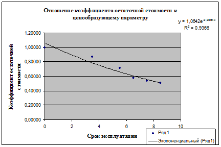 Произведенный регрессионный анализ показал, что наиболее точно можно описать зависимость величины мультипликатора стоимости от срока эксплуатации оборудования с помощью экспоненциальной модели.