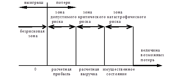 Под зоной допустимого риска будем понимать область, в пределах которой данный вид предпринимательской деятельности сохраняет свою экономическую целесообразность, т. е. потери имеют место, но они меньше ожидаемой прибыли. Граница зоны допустимого риска соответствует уровню потерь, равному расчетной прибыли от предпринимательской деятельности.