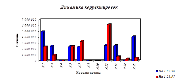 Таблица корректировок. Данные приведённой таблицы свидетельствуют о некотором улучшении положения банка: корректировка А1 (недонасозданный резерв на потери по ссудам) снизилась на 51,7 % за пол года, что говорит о начислении средств в данный резерв (данный факт свидетельствует о законопослушании банка), на 87,8 % по сравнению с 1.07.96 года сократились проценты, просроченные более 30 дней.