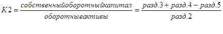 2. Коэффициент обеспеченности собственными оборотными средствами (К2) характеризует, какая часть оборотных активов организации сформирована за счет ее собственных средств. Согласно принятой методике его величина определяется следующим образом: