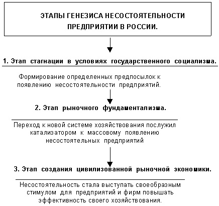 Итак, говоря о генезисе и дальнейшей эволюции несостоятельности компаний в условиях российской экономики, можно выделить три этапа, которые приведены в представленной ниже структурной схеме (рис. 1):
