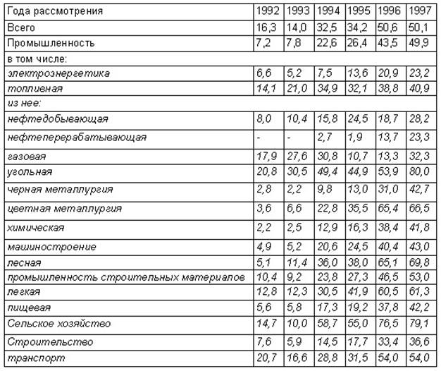 Как видно из таблицы, с 1992 по 1997 гг. ярко выделяется тенденция роста числа убыточных предприятий. Так, в 1992 г. количество несостоятельных компаний в российской промышленности составляло 16,3 % от общего их числа. На этапе рыночного фундаментализма количество несостоятельных предприятий увеличилось на 33,8% и составило к 1997 г. уже 50,1%.[9, с.32]