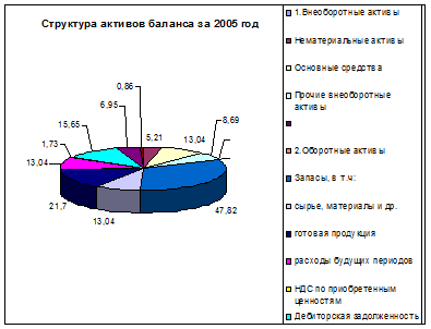 Значительная часть активов предприятия представлена оборотными активами, а именно: в 2005 году удельный вес оборотных активов составил 63,91%, при этом значительный удельный вес оборотных активов в 2005 г. обеспечивался высоким удельным весом запасов, который составил 40,73% в общей величине активов предприятия. Доля НДС по приобретенным ценностям в активах предприятия составила в 2005 году 3,41%. Доля дебиторской задолженности в активах предприятия в 2005 г. составила 10,24%. Доля денежных средств в 2005 году составила 8,78%. Доля краткосрочных финансовых вложений низка, в 2005 г. она составила 0,73%.