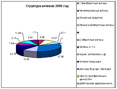 Удельный вес оборотных активов в 2006 году составил 62,9%, при этом значительный удельный вес оборотных активов в 2006 г. обеспечивался высоким удельным весом запасов, который составил 40,64% в общей величине активов предприятия. Доля НДС по приобретенным ценностям в активах предприятия составила в 2006 году 3,02%. Доля дебиторской задолженности в активах предприятия в 2006 г. составила 7,36%. Доля денежных средств в 2006 г. составила 10,5%. Доля краткосрочных финансовых вложений низка, в 2006 г. она составила 1,37%.
