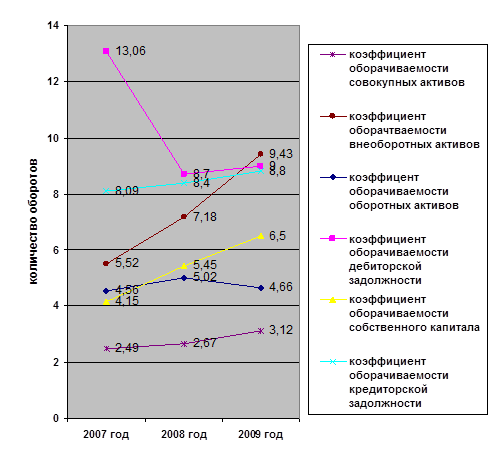 Из полученных данных видно, что оборачиваемость активов незначительно была меньше в 2007 году по сравнению с 2008 годом, но к концу 2009 года возросла оборачиваемость активов на 0,45 – это положительное явление. У коэффициента оборачиваемости собственного капитала прослеживается увеличение скорости оборота на 1,3 пункта с 2007 по 2008 год, а с 2008 по 2009 год количество оборотов увеличилось на 1,05 пункта.
