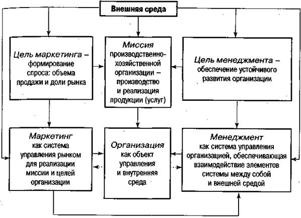 Главный принцип маркетинга – ориентация на потребителя и его потребности, их формирование и максимальное удовлетворение. Реализация этого принципа во всех сферах производственно-хозяйственной деятельности осуществляется через менеджмент, основные функции которого – целеполагание, планирование, организация, мотивация и контроль. На рис. 2 с использованием системно-целевого подхода показана взаимосвязь маркетинга и менеджмента производственно-хозяйственной организации.
