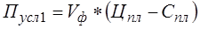 - первый условный показатель прибыли, показывающий, какое значение имела бы прибыль при фактическом объеме реализации продукции и плановой цене и плановой себестоимости;