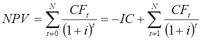 Для потока платежей CF (Cash Flow), где CFt — платёж через t лет (t = 1, .,N) и начальной инвестиции IC (Invested Capital) в размере IC = − CF0 чистый дисконтированный доход NPV рассчитывается по формуле: